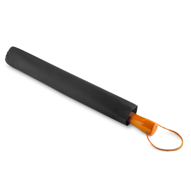 Guarda-chuva com Cabo de madeira e haste de metal + capa protetora, botão acionador para abertura automática, tecido ponge chinês, seda crua poliéster, oito varetas.